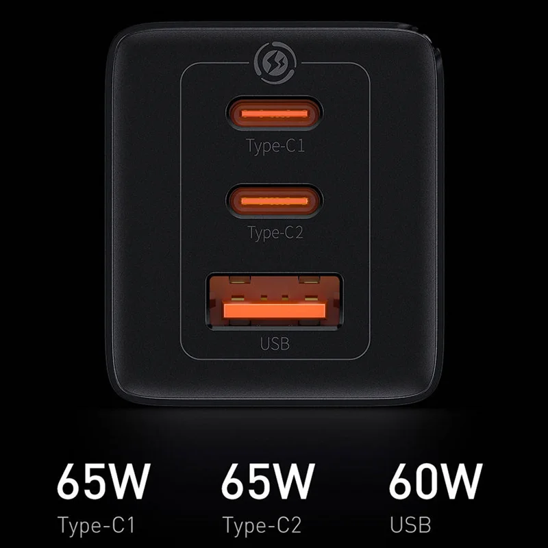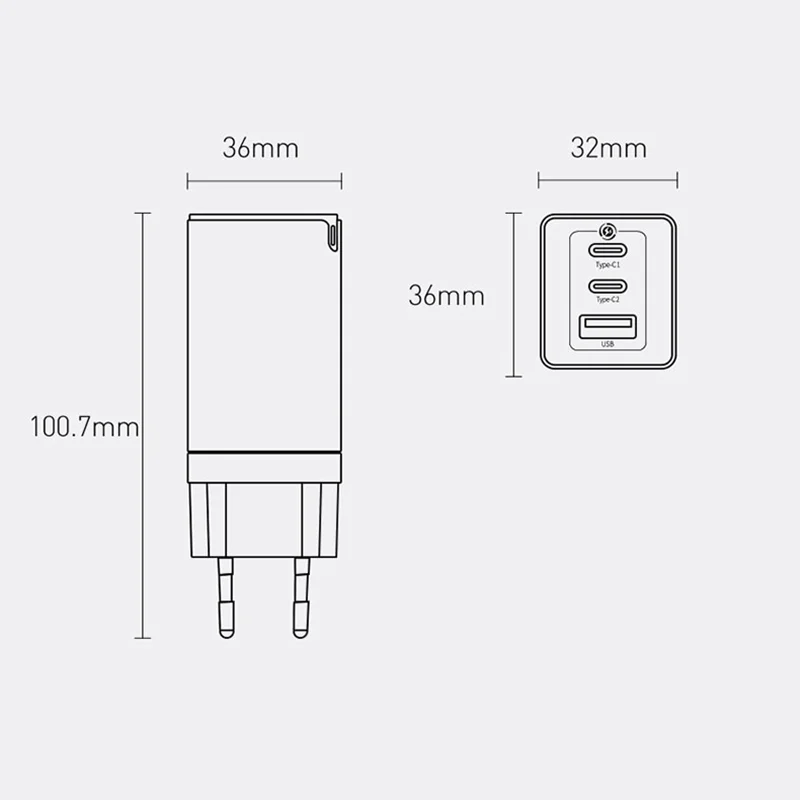 روی این شارژر 3 پورت میبینیم که دو تای آنها Type-C و پورت دیگر USB هستند. تمام این پورتها از تکنولوژی فست شارژ پشتیبانی میکنند که در ادامه به بررسی آن میپردازیم.دو شاخه شارژر دیواری بیسوس GaN3 Pro از نوع EU بوده.