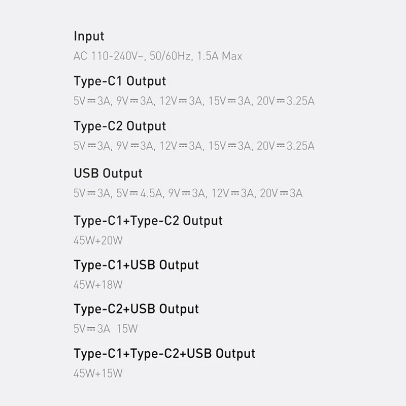تایپ سی 1 یا 2 به تنهایی: 5 ولت 3 آمپر | 9 ولت 3 آمپر | 12 ولت 3 آمپر | 15 ولت 3 آمپر | 20 ولت 3.25 آمپر=65W