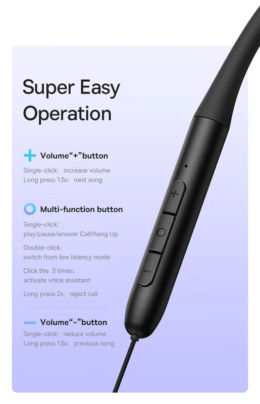 بر روی بدنه ی هندزفری بلوتوث گردنی بیسوس P1 Bowie یک کنترل پنل با سه دکمه قرار گرفته شده که شما می توانید برای کنترل موریک، مکالمه و دستیار صوتی از آن استفاده کنید. نحوه عملکرد این دکمه ها به شرح زیر است: