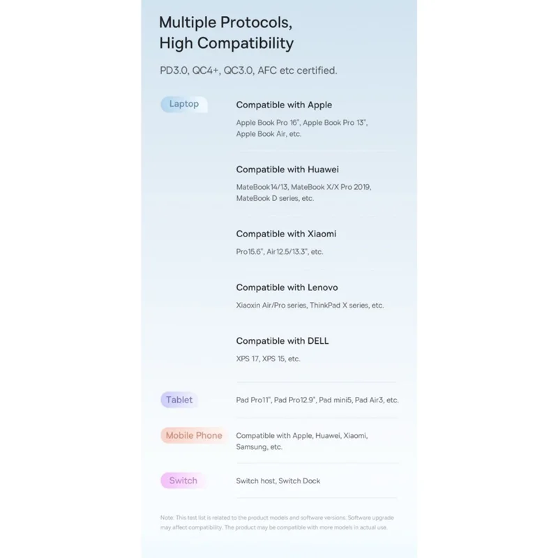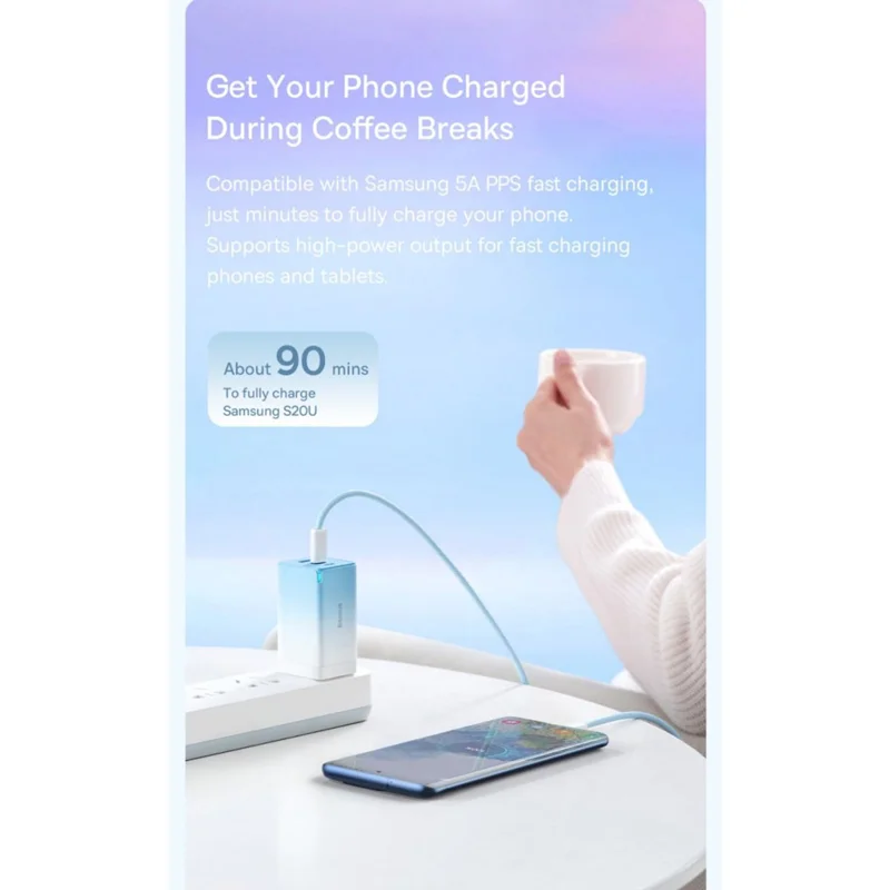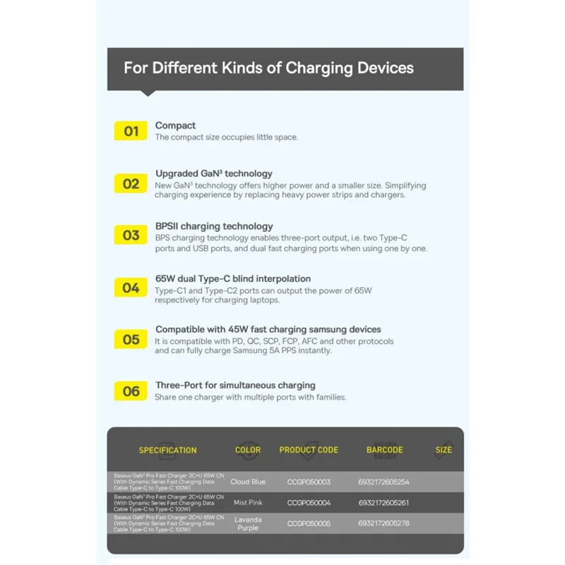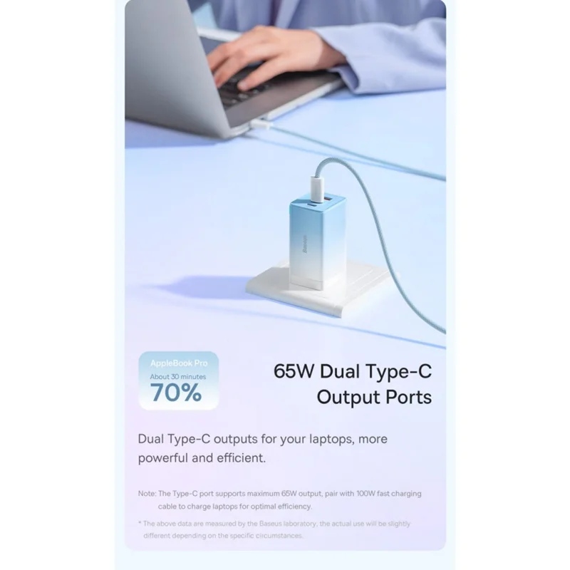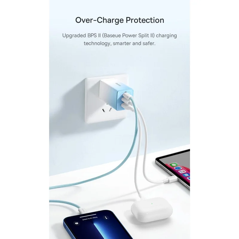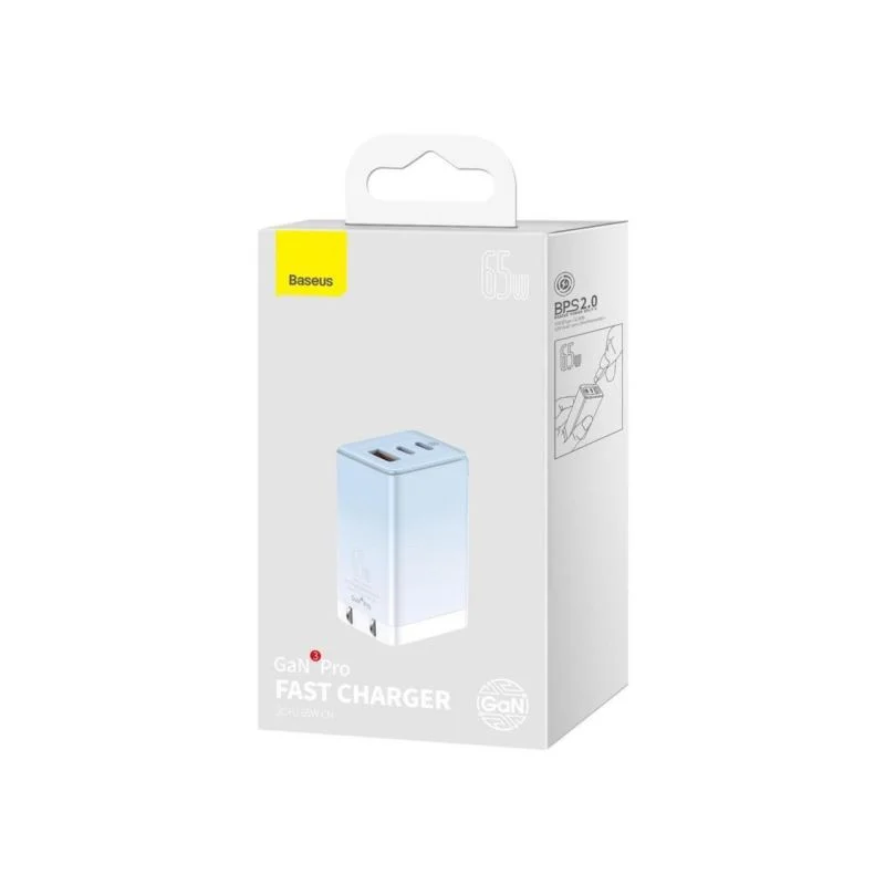 توان خروجی کلی آداپتور فست شارژ بیسوس برابر با 65W بوده و ولتاژ ورودی آن برابر با 110-240V است. تکنولوژی Baseus Power Split II یا BPS II از نوآوری های شرکت بیسوس است که اجازه میدهد تا توان بین 3 پورت تقسیم شده و هر پورت آداپتور شارژ سریع بیسوس بتواند با توان بالا دستگاهها را شارژ کنند. GaN3 Pro در واقع خلاصه شدهی Gallium Nitride یا گالیوم نیترید است که یکی از مواد نیمه رسانای جدید محسوب میشود. از جمله ویژگیهای این ماده میتوان به پهنای باند بالا، رسانایی گرمایی زیاد، مقاومت گرمایی زیاد، مقاوم تابشی، مقاومت در برابر اسید و قدرت و استحکام بالا اشاره کرد.