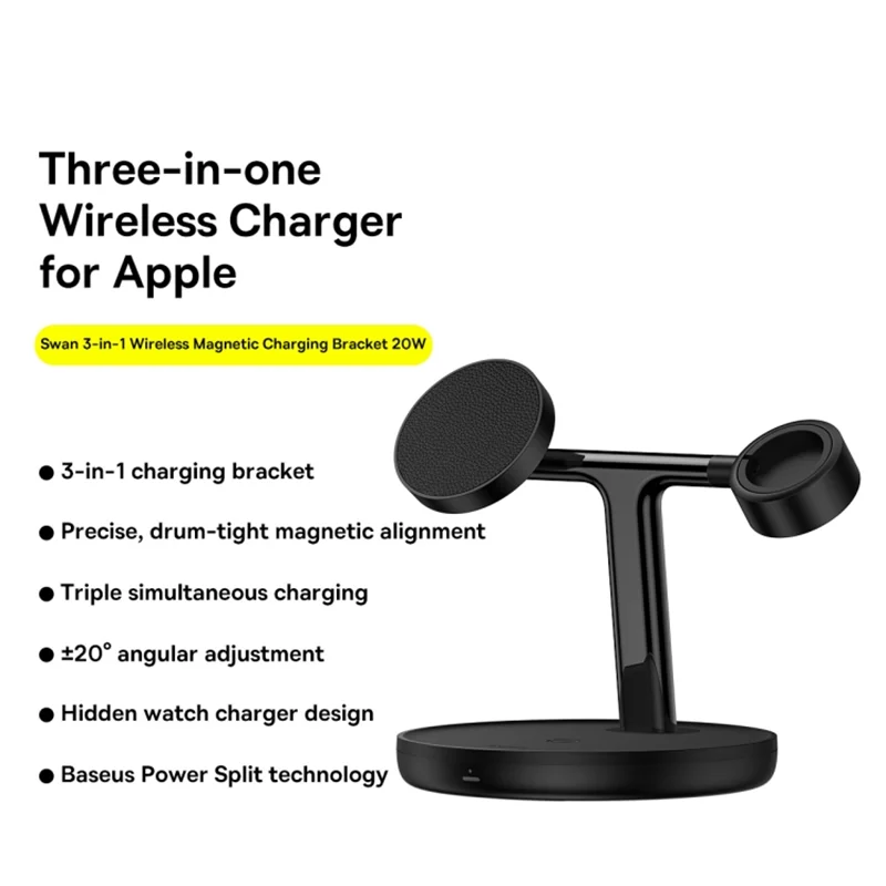 اگر میخواهید آیفون، اپل واچ و ایرپاد خود را به صورت وایرلس شارژ کنید، شارژر وایرلس Baseus Swan WXTE000101 انتخاب مناسبی است. شارژر بیسوس دارای شارژر مگنتی برای آیفون 12 به بعد، محلی برای قرارگیری شارژر اپل واچ و پد شارژ برای شارژ ایرپاد2 به بعد است.توجه داشته باشید که این دستگاه شارژر اپل واچ ندارد و برای این منظور باید شارژر اپل واچ خود را داخل استند مخصوص آن قرار دهید.شارژر وایرلس Baseus Swan WXTE000101 به صورت 3 در 1 و مناسب دستگاه های اپل مثل آیفون 12 به بعد که از شارژر وایرلس پشتیبانی می کنند، ساخته شده است.استند شارژ بیسوس Swan WXTE000101 یک پد مگنتی مخصوص آیفون 12 به بعد، محلی برای شارژر اپل واچ و یک پد شارژ وایرلس برای دستگاهی مثل ایرپاد یا گوشی دیگر دارد.در قسمت مگنتی، 16 آهنربای بزرگ دقیقا سازگار با ماژول مگنتی آیفون قرار دارد که شارژ گوشی را ایمن کرده است. در این صورت شما نگران افتادن گوشی خود نخواهید بود و فرآیند شارژ سریع انجام خواهد شد. شارژر مگنتی قابلیت تنظیم زاویه تا 20 درجه را دارد.