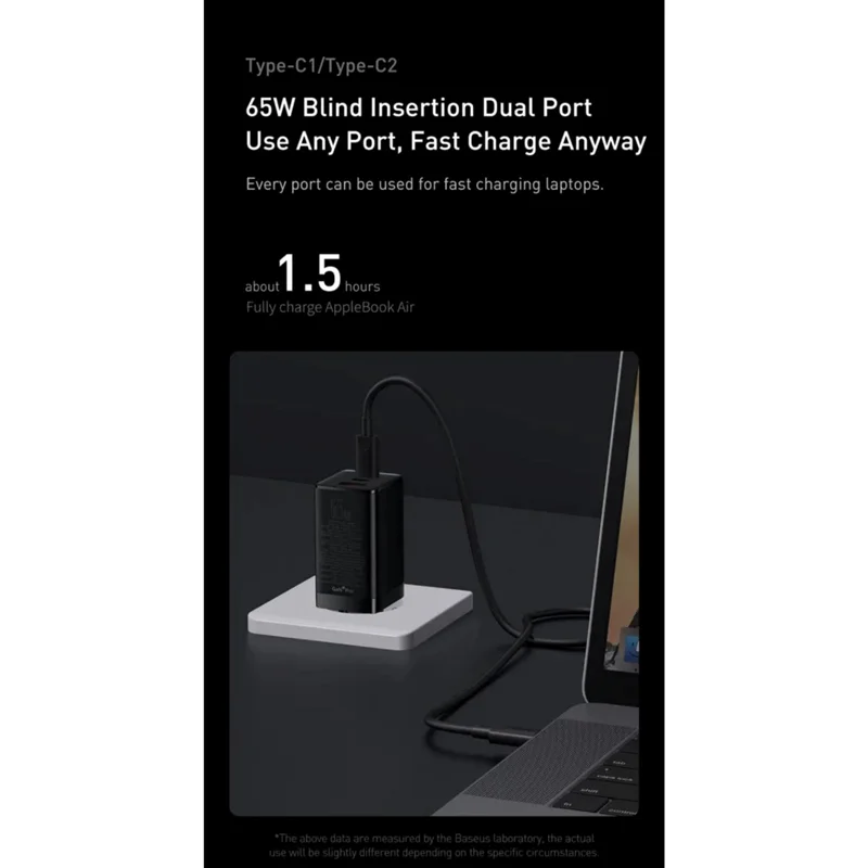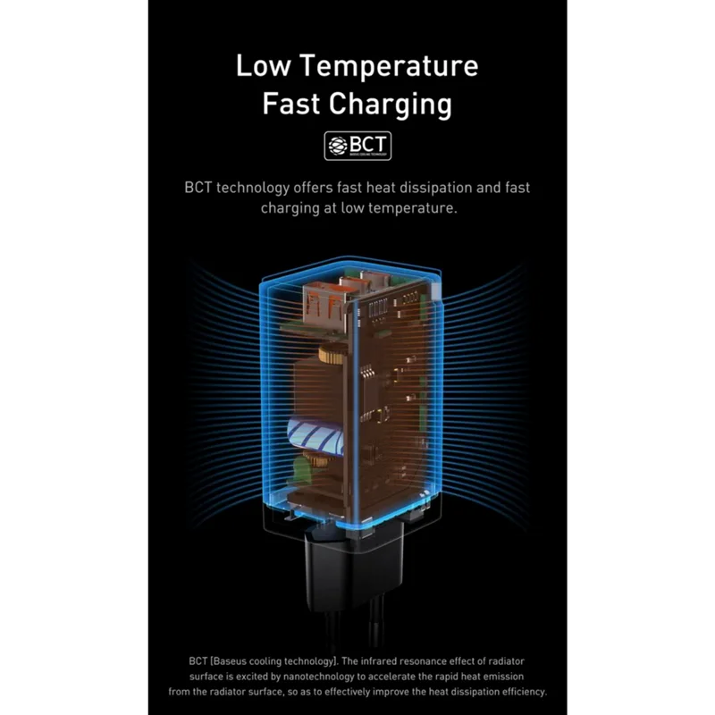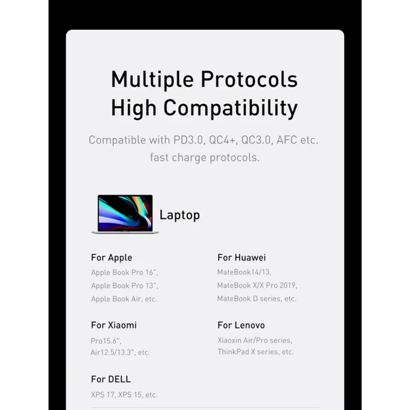 فناوری بهبود یافته GaN5 سرعت شارژ دستگاه های شما را تا 16.67 درصد افزایش می دهد! محصول Baseus از پروتکل های شارژ سریع PD3.0، QC3.0، SCP، AFC و PPS پشتیبانی می کند. با شارژر اصلی Baseus GaN5 Pro، باتری دستگاه اپل خود را 14 تا 50 درصد در 30 دقیقه شارژ خواهید کرد. همین مدت زمان کافی است تا سطح شارژ باتری اپل بوک ایر به 39 درصد برسد. این شارژر همچنین از فناوری شارژ سریع سامسونگ (45 وات) پشتیبانی می کند. شما می توانید به طور همزمان 3 دستگاه را شارژ کنید و فناوری BPS II وظیفه توزیع هوشمند برق بین دستگاه های شارژ شده و ایمنی آنها را بر عهده دارد.