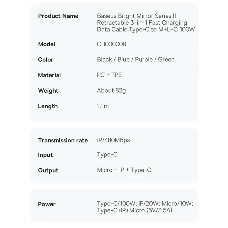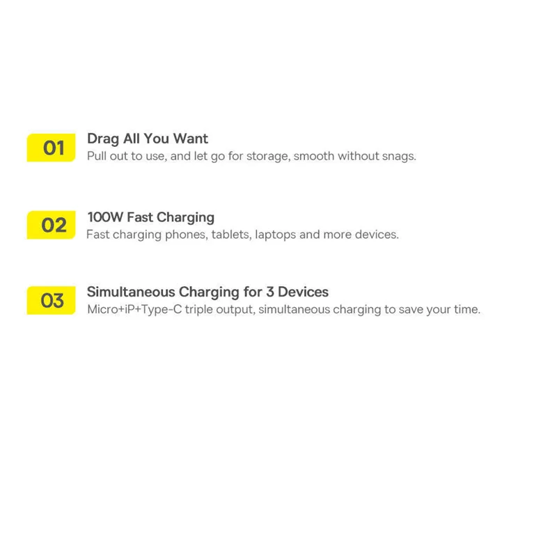 کابل سه سر سریع بیسوس Baseus Bright Mirror One-for-Three Retractable Data Cable 1.2m 100W