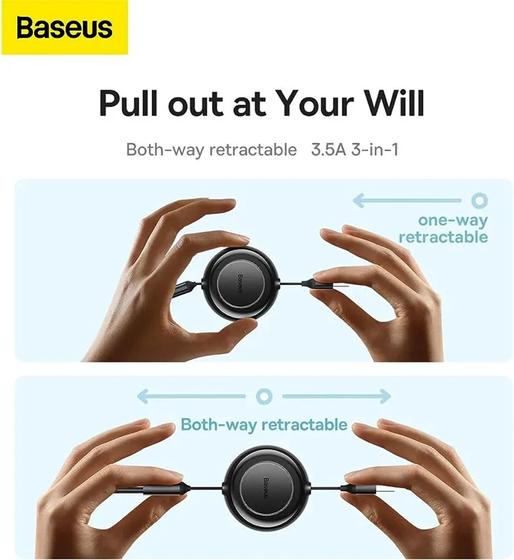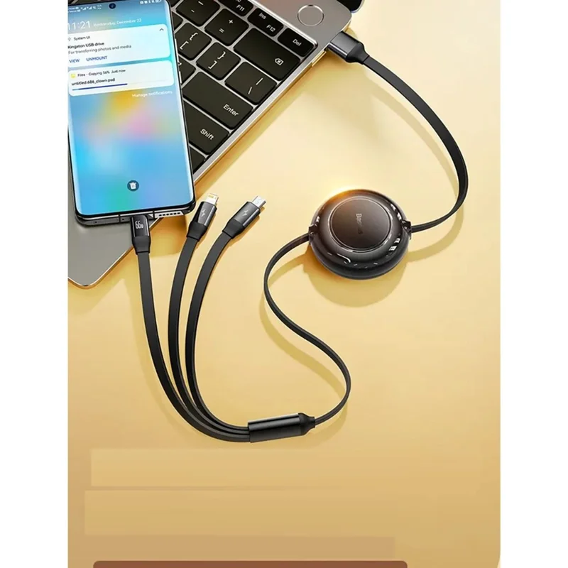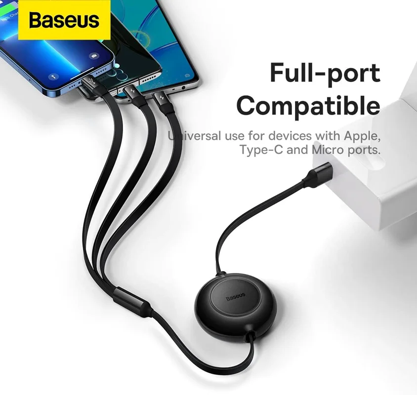 این کابل کاربردی از Baseus امکان شارژ سریع و ایمن 3.5 آمپر و انتقال داده بر روی کانکتور لایتنینگ با سرعت 480 مگابیت بر ثانیه را فراهم می کند. با کمک آن، دستگاههای سازندههای مختلف را شارژ خواهید کرد، زیرا کابل حداکثر 3 خروجی را ارائه میدهد: micro USB، Lightning و USB-C. شارژ همزمان سه دستگاه در زمان شما صرفه جویی می کند، علاوه بر این، به لطف طراحی جمع شونده می توانید طول کابل را مطابق با نیاز خود تنظیم کنید.