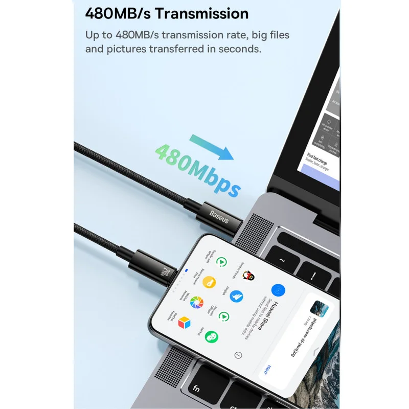 با Baseus می توانید از انتقال سریع فایل نیز لذت ببرید. کابل تنگستن طلایی سرعت انتقال تا 480 مگابیت بر ثانیه را ارائه می دهد. این به شما امکان می دهد عکس ها، اسناد یا فیلم های انتخاب شده را در کمترین زمان کپی کنید. دیگر بدون انتظار بی پایان - انتقال فایل ها در کمترین زمان و صرفه جویی در زمان!
