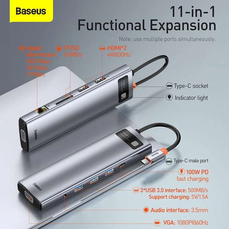 لپ تاپ شما پورت های کافی ندارد؟ آیا می خواهید قابلیت های آن را افزایش دهید؟ ساده تر از چیزی است که به نظر می رسد! هاب چند منظوره 11in1 Baseus مجهز به 3 پورت USB 3.0، 1 USB-C، 2 HDMI، 1 VGA، 1 اترنت و 1 عدد صوتی 3.5 میلی متری است. همچنین دارای اسلات برای کارت های SD و TF است. از انتقال فایل با سرعت بالا تا 5 گیگابیت بر ثانیه پشتیبانی می کند و می تواند تا کیفیت ویدیوی 4K را نمایش دهد. همچنین از شارژ سریع PD 100 واتی در درگاه USB-C پشتیبانی می کند. همچنین به دلیل اتلاف گرمای فوق العاده کارآمد و سازگاری گسترده خود متمایز است. متوجه خواهید شد که ارزش استفاده از یک پورت کامپیوتر برای به دست آوردن 11 عدد از آنها را دارد!