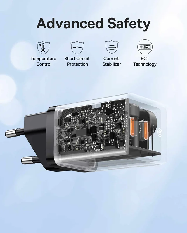 بدون نگرانی از آسیب دیدن تجهیزات خود از شارژر بیسئوس استفاده کنید. این محصول در برابر اضافه ولتاژ، جریان بیش از حد، میدان الکترومغناطیسی، اتصال کوتاه و غیره محافظت می کند. علاوه بر این، شارژر در برابر شعله مقاوم است و فناوری BCT دمای محصول را کنترل می کند و از گرم شدن بیش از حد آن جلوگیری می کند. علاوه بر این، Trickle Charging از دستگاه در برابر آسیب محافظت می کند.
