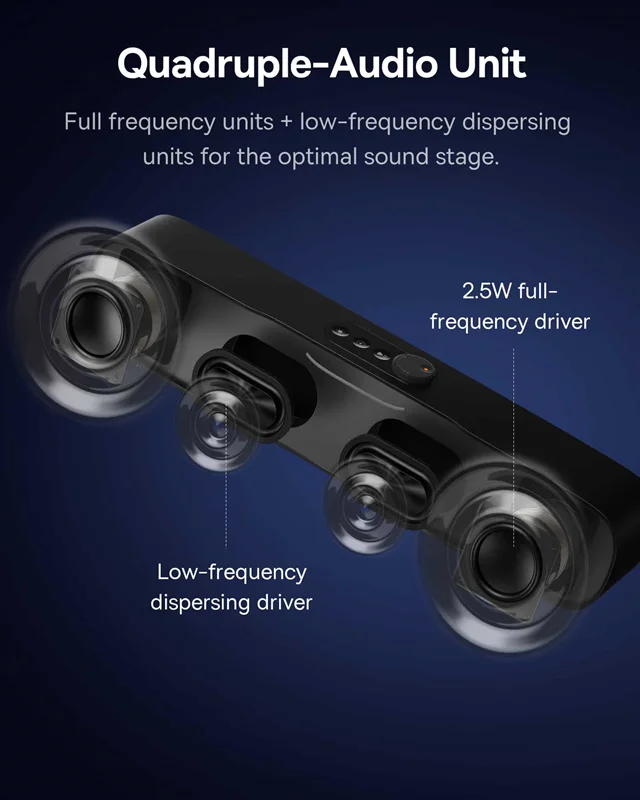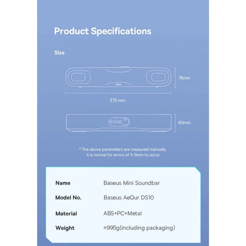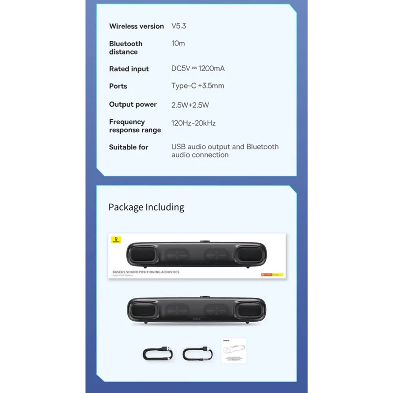 ساندبار مجهز به 2 مبدل فرکانس پایین و 2 مبدل فول برد است که هر کدام 2.5 وات توان دارند. این تنظیمات کیفیت صدای عالی را تضمین می کند. از غنای بیسابقهای از جزئیات، باس عمیق قدرتمند، و صداهای واضح و واضح لذت ببرید - با Baseus AeQur، جادوی صداها را دوباره کشف خواهید کرد!