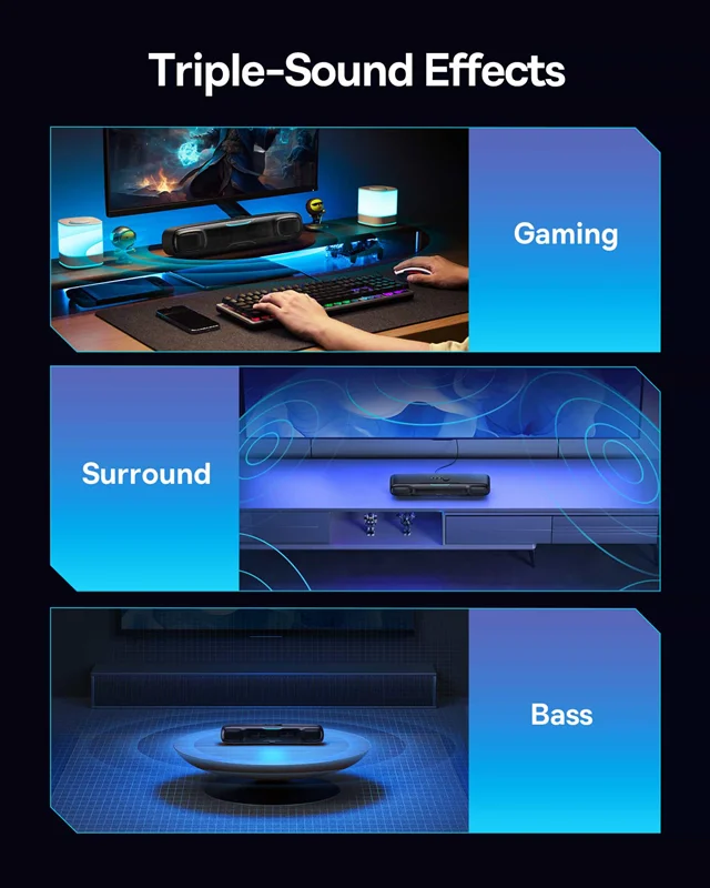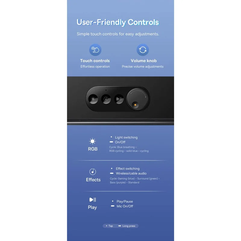 لحظات فراموش نشدنی را هنگام تماشای فیلم، گوش دادن به موسیقی یا بازی تجربه کنید. نوار صوتی Baseus AeQur کیفیت صدای فوقالعادهای را ارائه میدهد و به شما امکان میدهد از بین چندین افکت صوتی انتخاب کنید، بنابراین میتوانید عملکرد آن را مطابق با انتظارات خود سفارشی کنید. از چندین روش اتصال از جمله بلوتوث 5.3 پشتیبانی می کند. همچنین دارای یک میکروفون داخلی است که به شما امکان می دهد با دوستان خود در Discord چت کنید یا با سایر اعضای تیم در بازی آنلاین مورد علاقه خود ارتباط برقرار کنید.