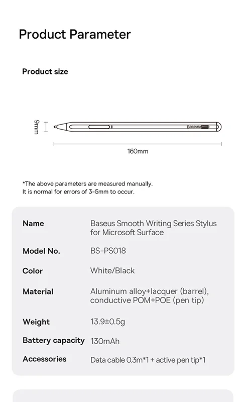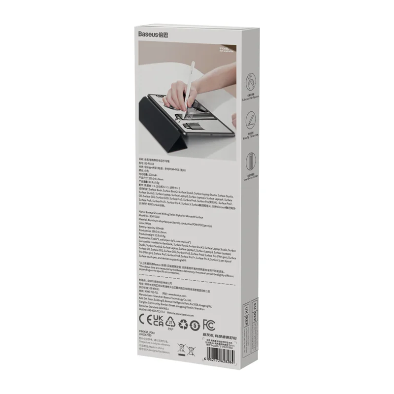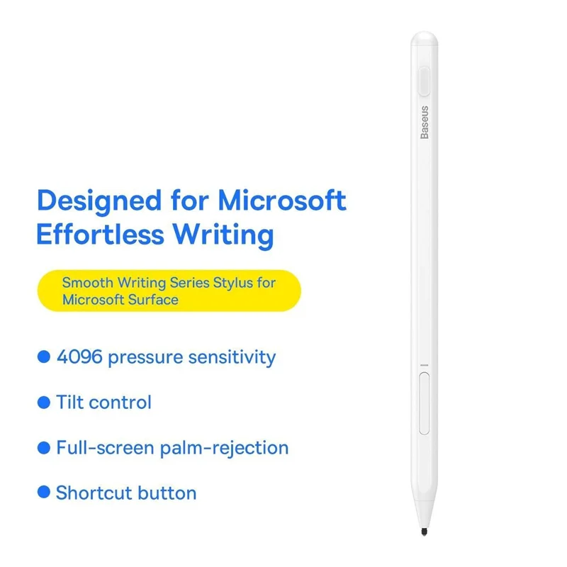کمپانی بیسوس در تولید انواع قلم لمسی بسیار فعال است و قلمی با کد SXBC070002 را هم طراحی کرده که مخصوص گوشی و تبلتهای مایکروسافت است,محصولی بسیار باکیفیت است و با MPP 2.0 (Microsoft Pen Protocol 2.0) سازگار است.از نظر طول این قلم لمسی 160 میلیمتر است و قطری برابر با 9 میلیمتر دارد؛ وزن آن هم حدود 14 گرم است. بدنه این قلم از آلیاژ آلومینیوم مات بوده و نوکی از جنس پلاستیک POM و POE دارد. پلاستیک POM یک ماده بسیار منعطف با اصطکاک بالا بوده و در برابر سایش بسیار مقاوم است؛ بنابراین، نوک این قلم هوشمند مایکروسافت در برابر آسیب بسیار مقاوم بوده و فوقالعاده روان است و از حساسیت و دقت بالایی برخوردار است.نوک آن قابل تعویض است و با یک چرخش میتوانید نوک جدید را جایگزین سری قدیم کنید.در دو رنگ سفید و مشکی عرضه شده و دارای قابلیت مغناطیسی بوده و می توانید به راحتی آن را به تبلت خود وصل کنید. کلیدی روی بدنه آن طراحی شده که با فشار دادن طولانی دکمه بالایی کلیک چپ موس فعال میشود. برای پاک کردن هم باید کلید پایین را طولانی فشار دهید.