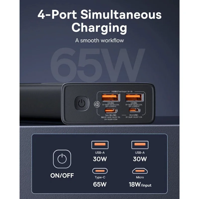 این پاور بانک زیبا دارای یک ورودی micro USB برای شارژ شدن و سه خروجی برای شارژ کردن که دو تای آن USB هستند و دیگری همان Type-Cهست که هم درگاه ورودی هست و هم خروجی می باشد.
