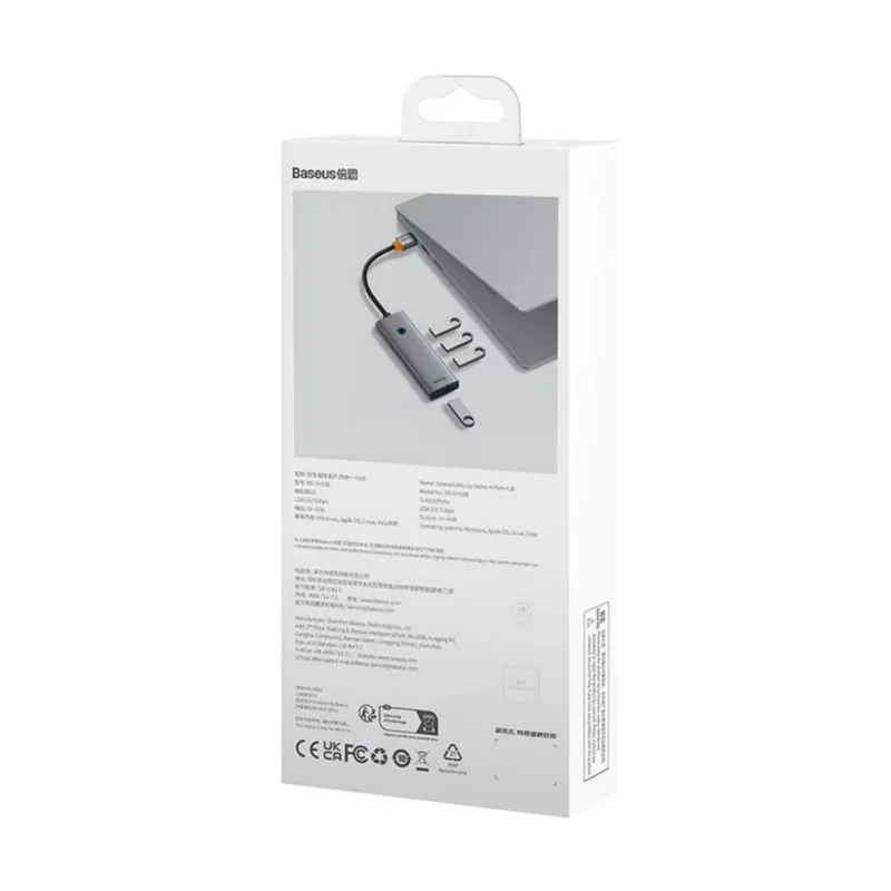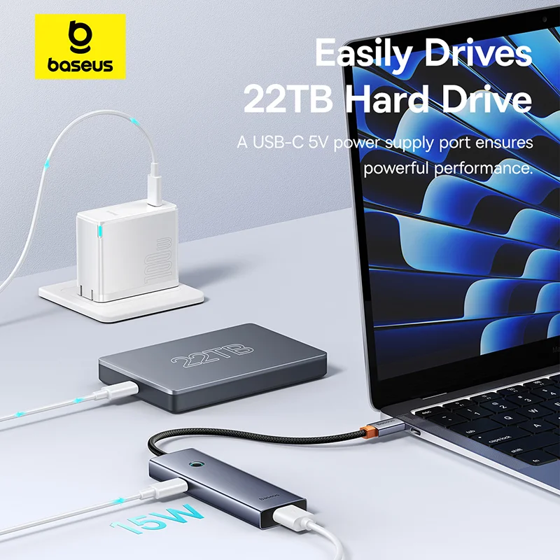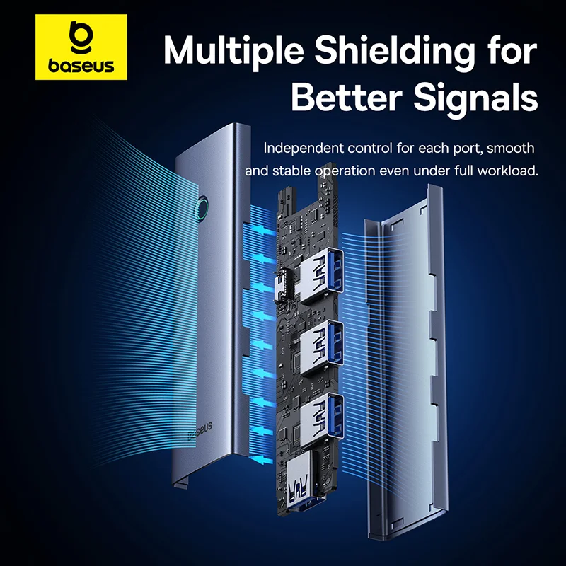 Baseus UltraJoy Series Hub مجهز به چهار درگاه USB 3.0 است که سرعت انتقال داده قابل توجهی تا 5 گیگابایت بر ثانیه را ارائه می دهد. این به طور قابل توجهی مدیریت فایل را تسریع می کند و امکان تبادل سریع داده بین دستگاه ها را فراهم می کند. این ویژگی به ویژه برای حرفه ای ها و علاقه مندان به چند رسانه ای که اغلب با فایل های حجیم کار می کنند بسیار مهم است.
