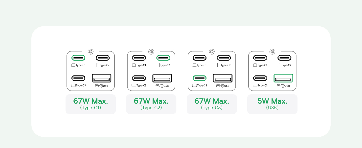 شارژ سریع USB-C: با 3 پورت USB-C 67 واتی در جلو، می توانید تقریباً هر چیزی از جمله تلفن، تبلت یا لپ تاپ خود را با سرعت بالا شارژ کنید. توجه: 3 پورت USB-C در صورت استفاده همزمان در مجموع 60 وات مشترک هستند.