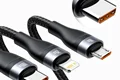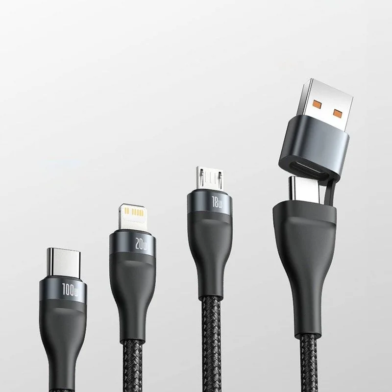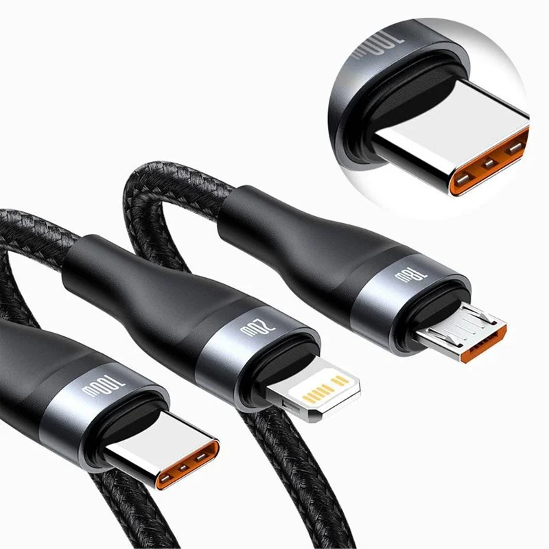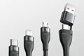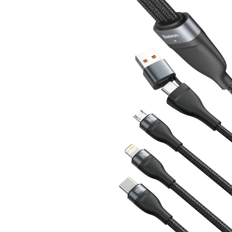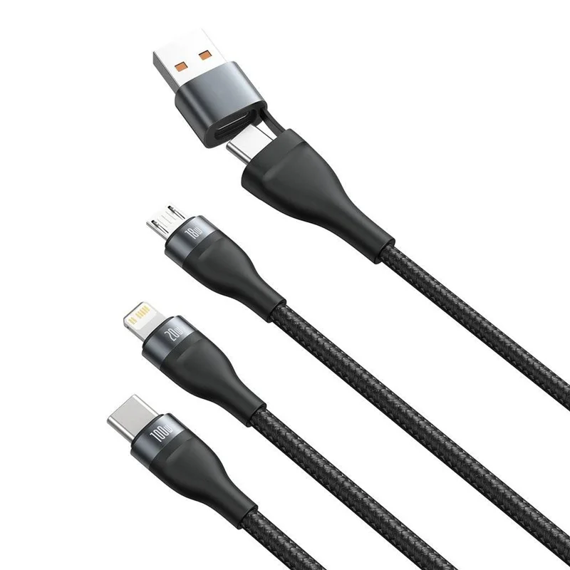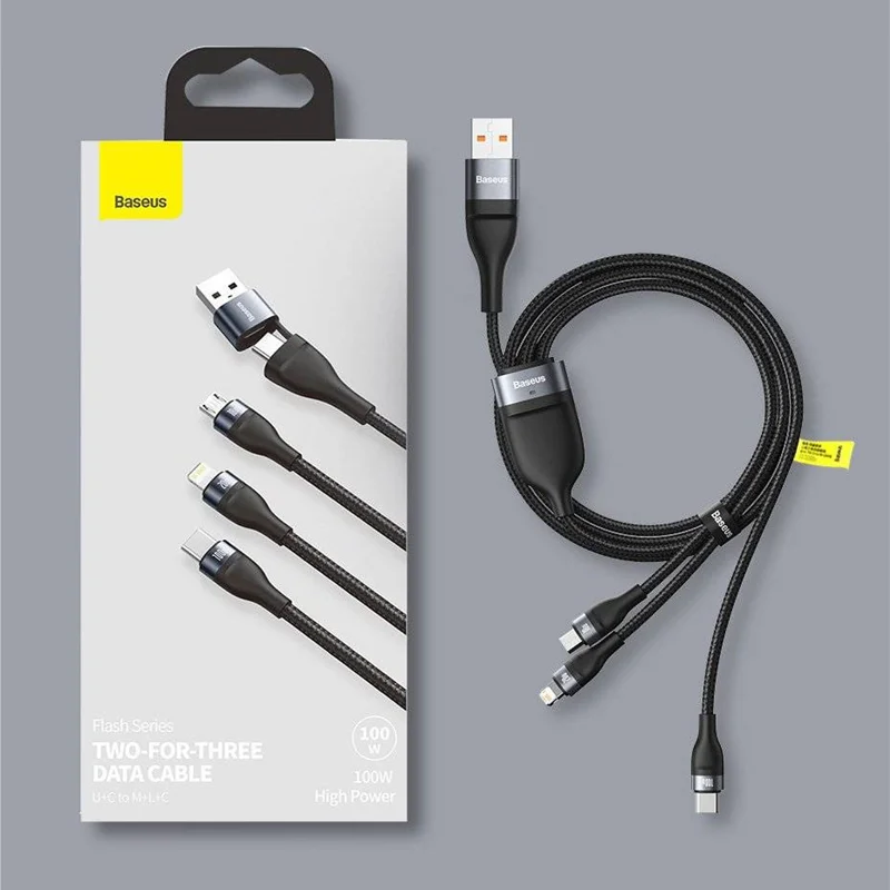 شرکت بیسوس این کابل را در سه رنگ با کدهای مختلف تولید کرده است. رنگ مشکی با کد CA2T3-G1 ، رنگ نارنجی با کد CA2T3-07 و رنگ سبز CA2T3-06 نشان داده می شوند.امروزه گوشی های موبایل دارای یکی از سه پورت شارژ لایتنینگ ، میکرو یو اس بی و تایپ سی هستند که شما برای شارژ هر کدام از این دستگاه ها که دارای پورت مخصوص به خود می باشد، باید کابل مخصوص آن را نیز با خود داشته باشید. کمپانی Baseus با ساخت کابل Flash Series 2 for 3 باعث شده تا شما بتوانید با به همراه داشتن یک کابل امکان شارژ هر سه نوع درگاه برای شما موجود باشد. این کابل دارای کانکتور های Lightning ،Type-C وMicro USB بوده و به شما این امکان را می دهد تا هر نوع گوشی را شارژ کنید.