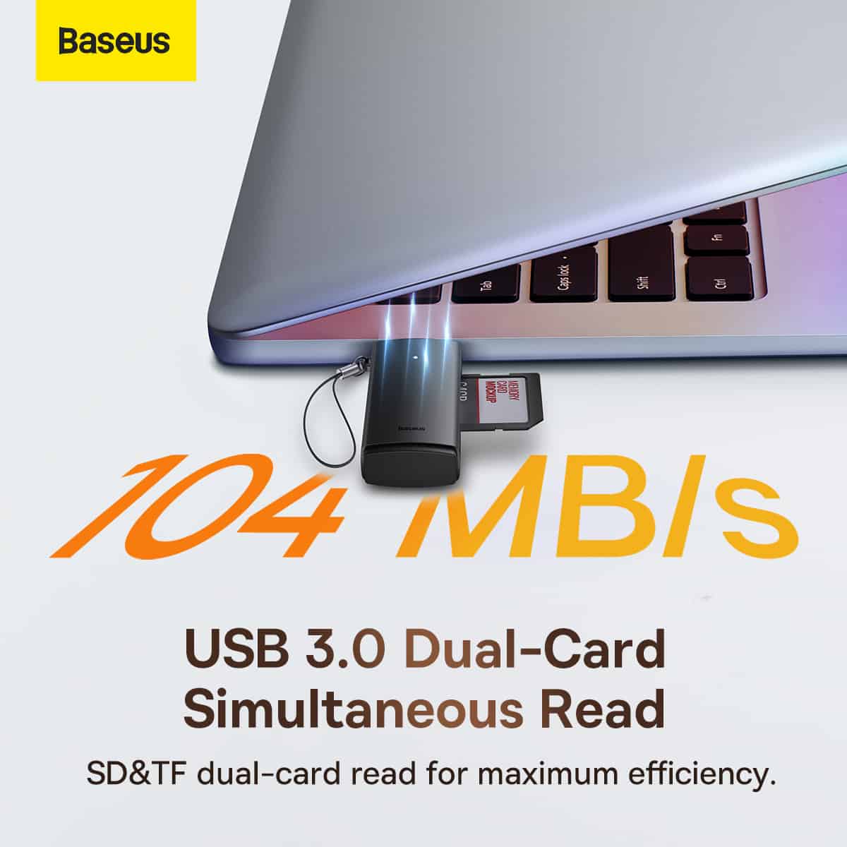 کارتخوان بیسوس Baseus WKQX070101 دارای درگاه کارت حافظه microSD و SD است و به کاربر این امکان را می دهد تا بتوانند اطلاعات خود را با سرعت بالا انتقال دهند. با قرار دادن رم درون جایگاه خود، می توانید اطلاعات درون آن را به کامپیوتر ارسال کنید. همچنین میتوانید از کارت حافظه تا سقف 2 ترابایت به کارتخوان بیسوس مدل Lite Series متصل کرده و از آن استفاده کنید. سرعت انتقال اطلاعات در کارت خوان بیسوس 104 مگابایت بر ثانیه است.