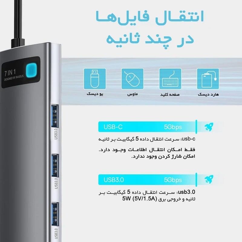 هاب 7 در 1 بیسوس، 3 درگاه از نوع USB3.0 با سرعت انتقال 500 مگابایت فایل بر ثانیه دارد که میتوانند دسترسیهای شما را بهشدت گسترش دهند. اگر میخواهید اطلاعات فلشتان را برروی گوشی موبایل خود بخوانید یا ماوس و کیبوردتان را به لپتاپ یا تبلتتان متصل کنید، به این پورتهای یو.اس.بی نیاز پیدا خواهید کرد.