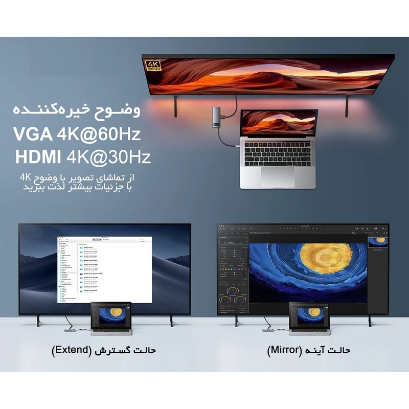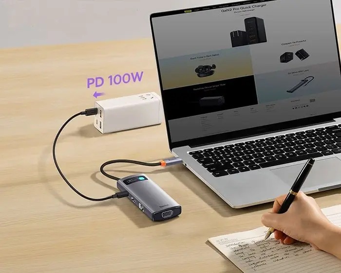 درگاهی که در قسمت پایینی هاب بیسوس دیده میشود از نوع VGA است. همانطور که میدانید، با وجود جایگزین شدن پورتهای سریعتر، هنوز هم خیلی از نمایشگرها به این درگاهها مجهزند که از طریق این محصول میتوانید به آنها متصل شوید. تصاویر و صداهای انتقالی از پورت VGA این هاب، 1080×1920 پیکسل رزولوشن دارند و 60 هرتز کیفیت.