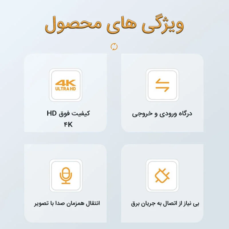 در نظر داشته باشید که کیفیت انتقال تصاویر 4K نیز با این محصول ممکن خواهد بود و از این قابلیت پشتیبانی می کند. برای دستگاه سه LED نیز قرار داده شده است که یکی از آن ها دارای نور آبی است و نشان دهنده پورت ورودی است، دو تای دیگر نمایشگر اعداد 1 و 2 هستند که خروجی را نشان می دهند (البته با توضیحات بالا، ورودی و خروجی ممکن است متفاوت باشد.)