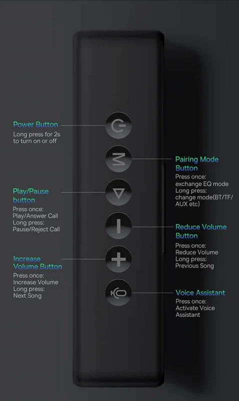 - کاربری کلید بعدی که با حرف M علامتگذاری شده برای تعیین حالت جفت شدن است. یعنی برای داشتن صدای بالانستری با یک بار فشار میتوانید آن را روی حالت EQ تنظیم کنید. با فشار طولانی هم قابل تنظیم روی حالتهای BT, TF, AUX و ... است.